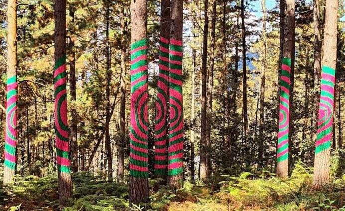 por sus más de 800 pinos pintados que crean figuras geométricas y humanas