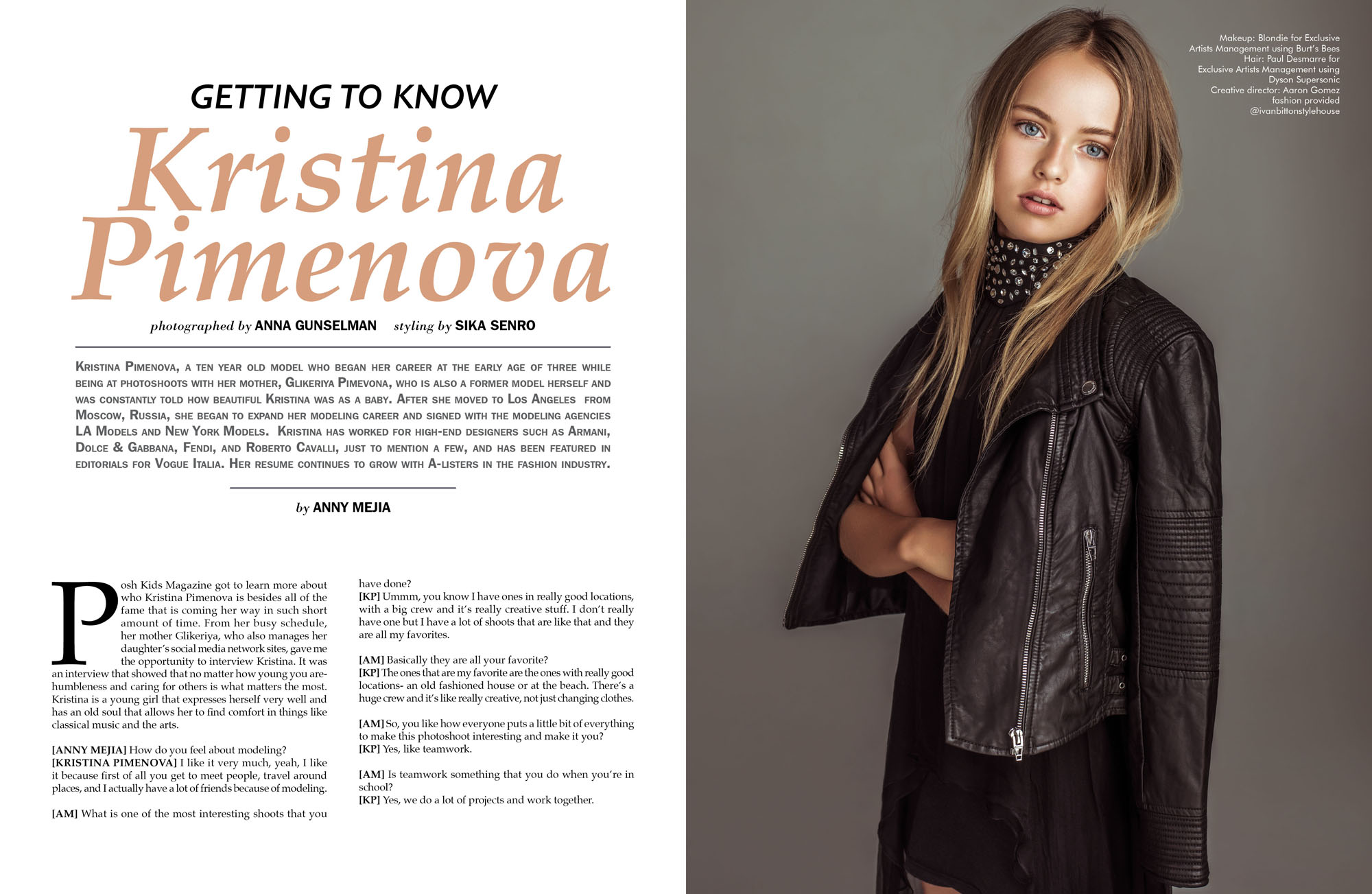 Kristina Pimenova es la hija de la economista Glikeriya Shirokova y el futbolista retirado ruso Ruslan Pimenov, quien jugó en los equipos del FK Dinamo Minsk, FC Lokomotiv Moscú, así como para la Selección de fútbol de Rusia. Con tan solo nueve años, Kristina ya había participado de importante contratos como modelo en marcas tales como Armani, Dolce & Gabbana, Roberto Cavalli, Dsquared2, Ermanno Scervino, Replay, Fendi, Benetton y muchas otras. Apareciendo en numerosas campañas publicitarias, incluyendo Roberto Cavalli Junior, Vogue Bambini Armani Junior. No cabe duda que, a partir de ahora, estas campañas serán mucho más habituales y pasarán a formar parte de su día a día. |