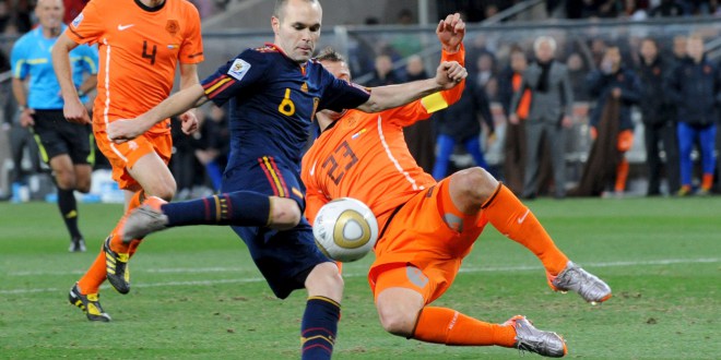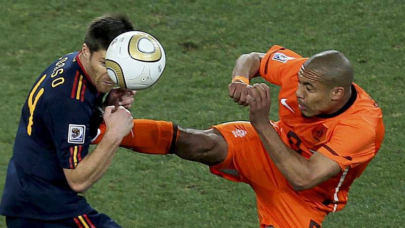 Los mejores del mundo. España consiguió lo que se merecía, soñaba y, mucho más importante, lo que más de medio mundo demandaba, al derrotar a Holanda en la segunda parte de la prórroga de la final del Mundial de Sudáfrica, gracias a un tanto de Andrés Iniesta en el minuto 116. Esta vez sí hubo final feliz y los millones de tópicos futboleros se esfumaron de un plumazo. La roja sufrió, perdonó y recibió, mientras Holanda apostó desde el inicio por acabar con la belleza y la plasticidad del fútbol español. Los destructores tenían nombre propio: Van Bommel y De Jong. |