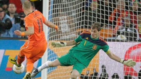 La final de la Copa Mundial de Fútbol de 2010 se disputó el 11 de julio en el Estadio Soccer City de la ciudad de Johannesburgo, Sudáfrica. Este encuentro lo protagonizaron las selecciones de los Países Bajos y España, que se clasificaron tras vencer a Uruguay y Alemania, respectivamente, en las semifinales. El equipo español derrotó a los neerlandeses por la cuenta mínima, con gol de Andrés Iniesta conseguido sobre el final del tiempo suplementario a los 116 minutos de juego, logrando de esta manera su primer título mundial. |
