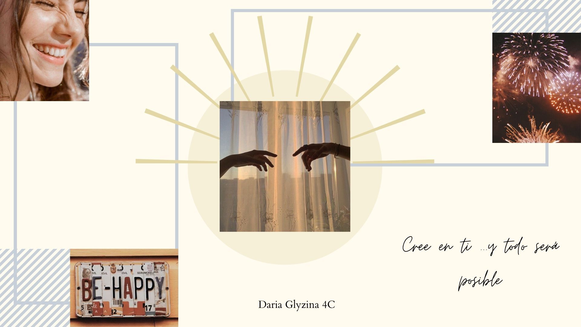 IDEA PRINCIPAL La felicidad es algo instantáneo aparece y desaparece como los fuegos artificiales. Aunque solo sean momentos, es lo mas preciado en nuestras vidas y nos aferramos a ella con todas nuestras fuerzas. La meta es ser feliz pero lo realmente lo importante es el camino hacia ella, con sus imperfecciones, intentos, fallos, decepciones, aprendizajes… Así soy yo, con decepciones, fallos, con mis problemas y altibajos pero siempre intento llegar a mi meta, ser feliz. |