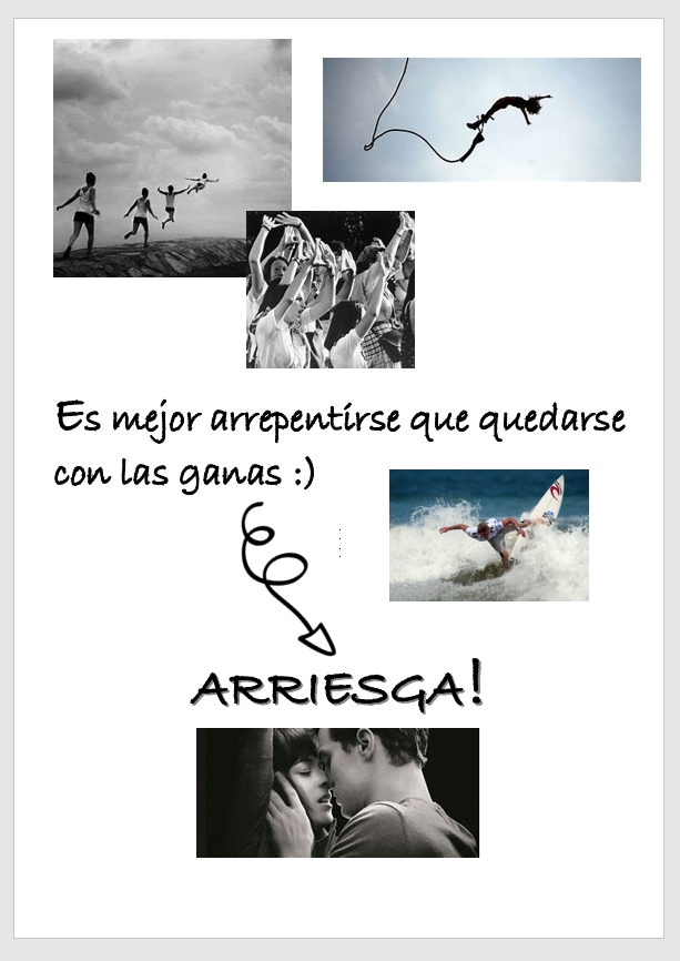 TEXTO Arriesgarse, ¿conseguiríamos algo sin arriesgarnos en algún momento? Tenemos tanto miedo a hacer o decir lo que sentimos… tantas dudas sobre si lo que de verdad deseamos seria lo correcto… muchas veces simplemente por miedo nos quedamos callados y ahora te digo, es tu momento: arriésgate y disfruta de más libertad. |